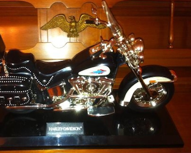 2012-08-16 - Trinity Fellowship Hall, Columbia, KY - Photo by Ken Hill. This highly collectible Harley Davidson Telephone was donated by Delbert Abbott of Abbott communications. I don't know the value, but it is very cool! - KEN HILL