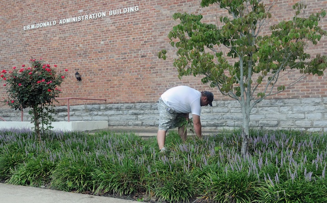 2012-08-16 - L.R. McDonald Administration Building, 210 Lindsey Wilson Street, Columbia, KY - Photo by Duane Bonifer. LWC. Lindsey Wilson College physical plant worker Charlie Crawhorn pulls weeds August 7 from the flowers behind L.R. McDonald Administration Building. Crawhorn and his co-workers worked during the summer to get the LWC A.P. White Campus ready for the liberal arts college's students, faculty and staff. - Duane Bonifer