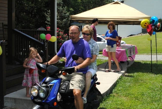 High hopes for the free flight of the balloons tied to the tent in the upper left of the photo, dimmed when David Grigsby, driver on scooter with his mother Beverly Grigsby, watched their ascent. He thought they might make Russell Springs, KY. Little did he know. The Grigsbys were celebrating the birthdays of Lillie, 5, left by the scooter and Avy, 3. In the background are Grigsby's son, Jeremy Grigsby, and David Grigsby's wife, Karen.