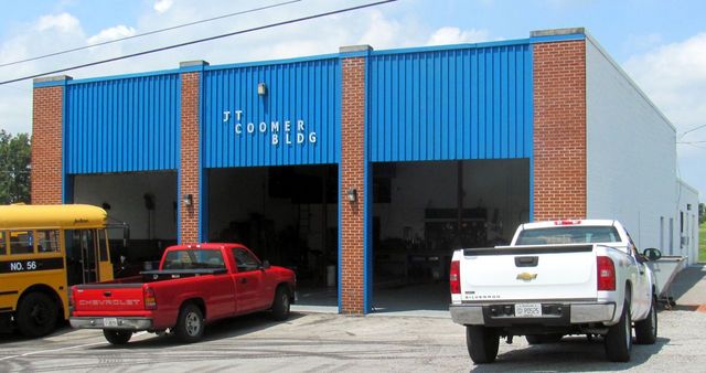 2012-08-13 - 342 Gen. John Adair Drive, Columbia, KY - Photo by Ed Waggener. A peak inside the J.T. Coomer Building hints at the attractive epoxy coated floors Superintendent Reed said were almost too pretty to pull school busses onto. Donnie Curry, Tommy Murray, Ronnie Bryant, and Roy Lockridge also worked on the 40 year old overhead doors, repairing them to good as new. Storage areas have been organized as well.