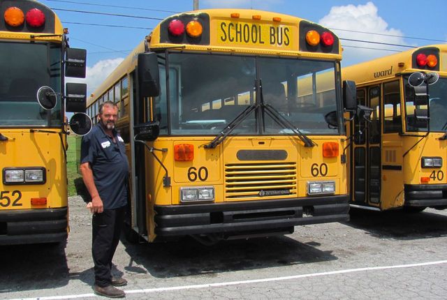 2012-08-13 - Adair County School District Campus, Columbia, KY - Photo by Ed Waggener. Mechanic Ronnie Bryant was getting bus No. 60 ready for a Friday, August 10, 2012 trip with important passengers aboard: The Adair County High School volleyball team, headed to Glasgow for competition with the Barren County High School Trojans. Busses are lined up with military precision, for safety as well as appearance sake; all are equal distance behind the white line, and all are parked centered within the allotted spaces. Bryant is one of the 'Magnificent Four,' who thought of, created a plan of action for, and executed the renovation of the J.T. Coomer Building.
