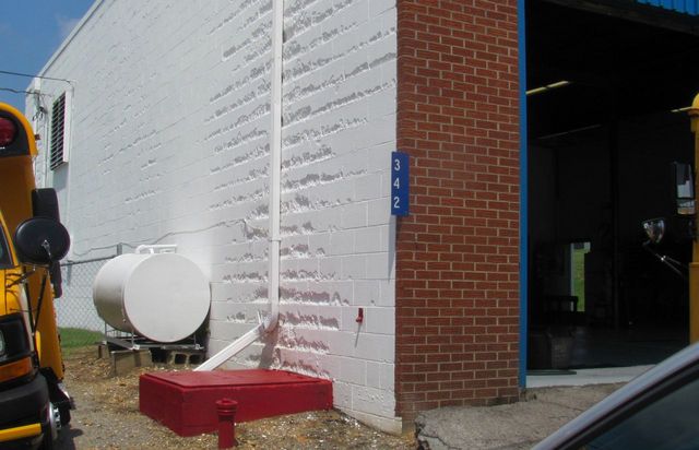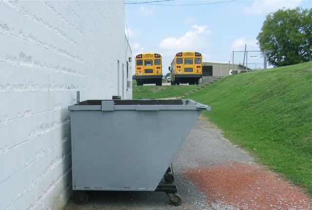 2012-08-13 - 342 Gen. John Adair Drive, Columbia, KY - Photo by Ed Waggener. Dumpsters all around the Adair County School District Campus will be painted. All will have a newly designed school logo affixed. A note on the pleasant side: An interesting aesthetic was a fortuitous benefit, with very desirable effect of the weather etching of the blocks after painting.
