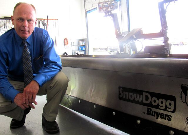 2012-08-13 - 342 Gen. John Adair Drive, Columbia, KY - Photo By Ed Waggener. Director of Student Transportation kneels by the new Snow Dogg snow plow which will be affixed to a pickup truck to clear the parking areas on the Adair County School District Campus when a snow hits. Jones bought the unit on the recommendation of Adair County Roads Superintendent Jobe Darnell. In his job as head of student transportation, he said, he's thankful to be able to work with Mr. Darnell and others responsible for keeping roads safe. "I just wish that everyone knew how much I appreciate the work Jobe, Donnie and Junior do to make sure the roads are safe when our busses roll," he said. "They're the best in the state of Kentucky." He was referring, also, to Donnie Rowe, Superintendent of the City of Columbia Street Department, and Junior Brown, head of the Adair County Kentucky Highway Department Maintenance group.
