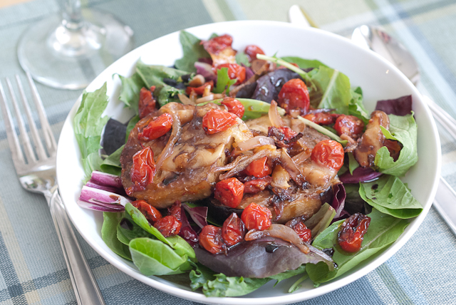 2012-08-10 - Photo by Pen. Eggplant roasts beautifully with tomatoes, onion slivers, and garlic. Coated in a mixture of olive oil, red wine, and oregano, and topped with a sturdy cheese like parmesan or asiago, the mix is best when left in the oven until you've forgotten about it and then remembered it again. Here it's served on a bed of mixed greens, and finished with a good balsamic vinegar and just a little extra virgin olive oil.