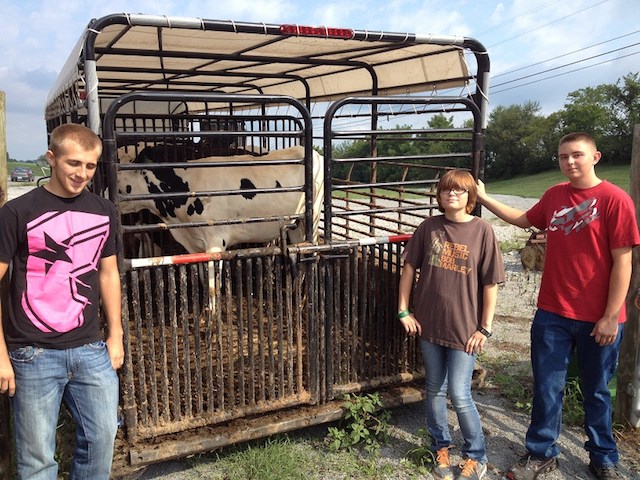 2012-08-10 - 184 FFA Drive, Columbia, KY - Photo by Diana Trejo. Today, Friday, August 10, 2012, on just the second day of school, some of our new freshmen were able to experience working in our FFA Livestock Barn when Brad Burton called and needed to get a weight on some Holstein heifers. The FFA welcomes anyone from the community to bring their livestock to the barn where they can be weighed on certified scales. Also available is a complete line of livestock health and working equipment. Students are able to learn in hands-on situations not available in other courses. From left, above, are Jarret Martinez, Dakota Smith, and Cody Lawhorn. - Diana Trejo