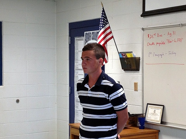 2012-08-10 - Columbia, KY - Photo by Diana Trejo. Freshman Joshua Grant recites the entire FFA Creed on the second day of school at Adair County High, Friday, August 10, 2012. The entire creed is five paragraphs long. -Diana Trejo, FFA Reporter