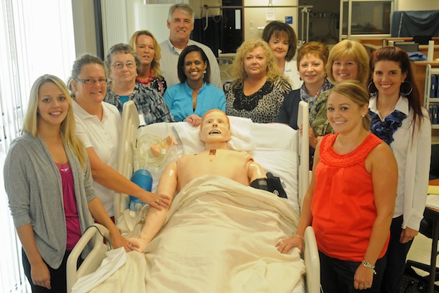 2012-08-09 - 413 Helen Flatt Drive, Columbia, KY - Photo by Duane Bonifer, LWC photo. John Gillespie of Laerdal Medical joins members of the Lindsey Wilson College Nursing Division Tuesday morning in the Dr. Robert & Carol Goodin Nursing & Counseling Center around the program's new patient simulator. From left: Ashley Hancock, full-time faculty member; Teresa Burton Whitaker, adjunct faculty member; Donna Antle, adjunct faculty member; Elle Adams, full-time faculty member; Gillespie; Makeda Mulugeta, adjunct faculty member; Melissa Sneed, adjunct faculty member and Westlake Regional Hospital intensive care unit manager; Celia Downey, Westlake Regional Hospital nursing director; Marian Smith, LWC nursing division chair; Cindy Brezt, LWC nursing administrative assistant; Monica Kidder, full-time faculty member; and Emiley Button, full-time faculty member. - Duane Bonifer