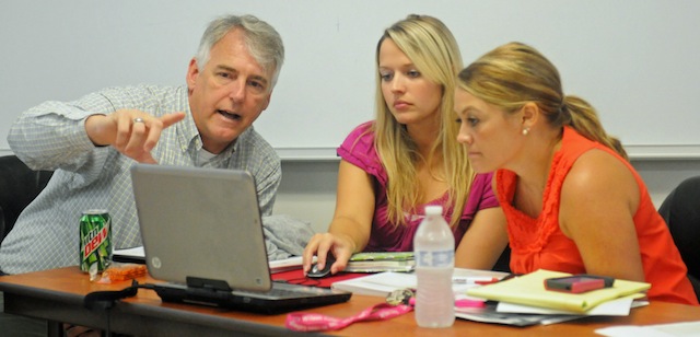 2012-08-09 - 413 Helen Flatt Drive, Columbia, KY - Photo by Duane Bonifer. LWC. John Gillespie of Laerdal Medical, left, shows Lindsey Wilson College nursing faculty members Ashley Hancock, center, and Emiley Button how to build a physiological report that can be used with the program's new patient simulator.