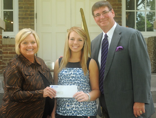 2012-08-09 - L.R. McDonald Administration Building, 210 Lindsey Wilson Street, Columbia, KY - Photo by Duane Bonifer, LWC photo. Briana Bertram of Columbia, KY, center, receives the $2,500 Community Trust Bank scholarship from Columbia branch manager Lee Ann Collins, left, and Lindsey Wilson College President William T. Luckey, Jr. in front of the college's L.R. McDonald Administration Building.