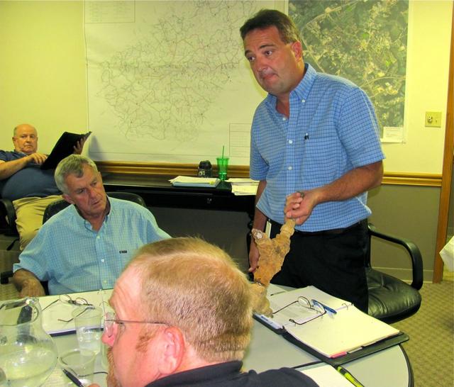 2012-08-10 - Grandview, 640 Watertower Bypass, Campbellsville, KY - Photo by Ed Waggener. Columbia/Adair Utilities District General Manager Lennon Stone showed a section of line and metering valve which was replaced in the Russell Road section of water lines. The valve had been leaking approximately 5,000 gallons of water a month, according to David Bowles of Monarch Engineering, the board's consulting engineer. The utility replaced the unit which is its responsibility, but Stone warned, the line from the metering valve into the user's water system may be just as bad, and could result in some customer's water to show only a high degree of improvement. Because of this, Stone said, there can still be off-color water, but the interior lines will be the customer's responsibility. The photo was taken at the Thursday, August 9, 2012, regular meeting of the District. Also in the photo, clockwise, are Board Member Tim Baker, Back to camera, foreground, Board Attorney Marshall Loy, and Board Member Rudy Higginbotham. All board members were present, including Chairman Robert Flowers, and members David Jones and Barry Stotts.