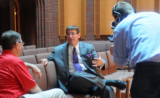 2012-08-08 - 302 Lindsey Wilson Street, Columbia, KY - Photo by Duane Bonifer, LWC photo. Lindsey Wilson College President William T. Luckey Jr., center, is interviewed Tuesday afternoon, August 7, 2012, in the college's John B. Begley Chapel by Howard W. Hewitt, left, and Adam Bowen of the Wabash (IN) College Communications & Marketing Office. Luckey was interviewed by his undergraduate alma mater for a video about successful alumni who graduated from the all-male liberal arts college. Luckey earned a bachelor's degree in biology from the college. - Duane Bonifer