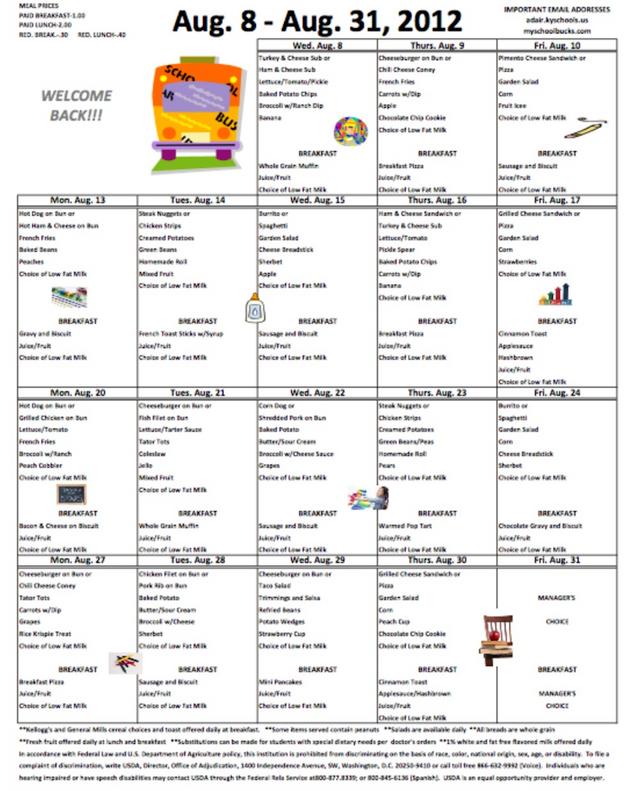 Adair County School Menu, August 8-31, 2012