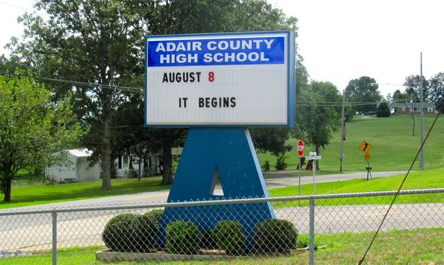 2012-08-05 - Greensburg Street & Indian Drive, Columbia, KY - Photo CM photo. The Big "A" sign at the entrance to the Adair County School District campus at Indian Drive off Greensburg Street is a reminder that school begins for students on Wednesday, August 8, 2012.