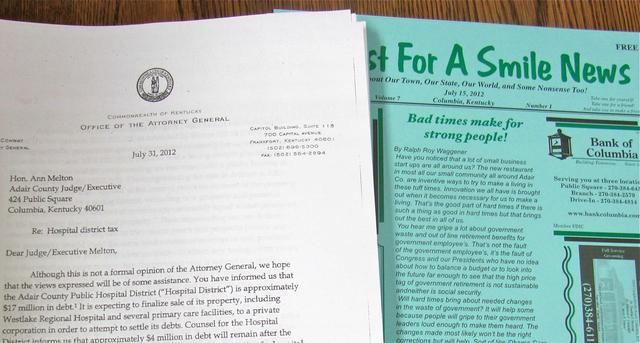 2012-08-06 - Adair Annex, 424 Public Square, Columbia, KY - Photo by Ed Waggener. And if you happen to go to the Adair Annex, handouts are available in most offices - in Suite 1, the Judge's office, there are copies of the Adair General's Opinion that the Hospital Tax is recallable and the latest It's Just for a Smile News. What is closed today is the Adair County Judicial Center, for one of the first three Administrative Office of the Courts (AOC) budget balancing furloughs. There are no circuit or district court cases on the docket for today, and driver's licenses can't be bought or renewed in the Circuit Court Clerk's office. Incidentally, anyone interested in the Hospital Crisis will find the document interesting.