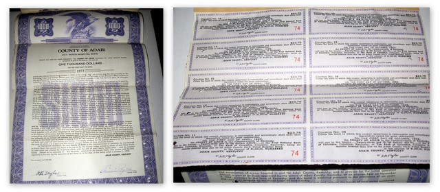2012-08-06 - Columbia, KY - Photo by Mike Watson. Thought this might of some interest, with the ongoing discussions. This above, left is a 1959 hospital bond, number 74, with face value of $1,000, payable in 1973, signed by H.B. Taylor, County Clerk, and Finis Pyles, County Judge. On the right is a photo of the coupons remaining. From my collection. - Mike Watson