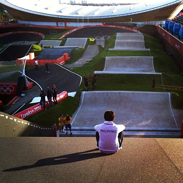 2012-08-06 - London, England, United Kingdom - Photo from David Grigsby. Lindsey Wilson BMX Cycling star, All-American Danny Caluag, looks over the starting hill of the Olympic track on Sunday, August 6, 2012. Caluag, a Californian with dual United States/Philippines citizenship, is competing for the Philippines. He's the first ever Lindsey Wilson Athlete to achieve this highest of all athletic honors as an Olympic competitor. It's another crowning achievement for the sport which most defines Lindsey Wilson's athletic programs - all spectacularly outstanding - in so much of the United States. And to put it in perspective: Competition in cycling, unlike other sports, is broadly based. Lindsey Wilson Cyclists compete against schools whose football, soccer, and basketball programs are NCAA Division I! When a Lindsey Wilson cyclist is All-American or the cycling program is regularly included in the top five teams in the nation - it really means just that - in all the United States. They're the best in America, regardless. No qualifiers! A huge, huge difference for every medal, every honor, every title the amazing Blue Raider cyclists bring back to Columbia! - CM.