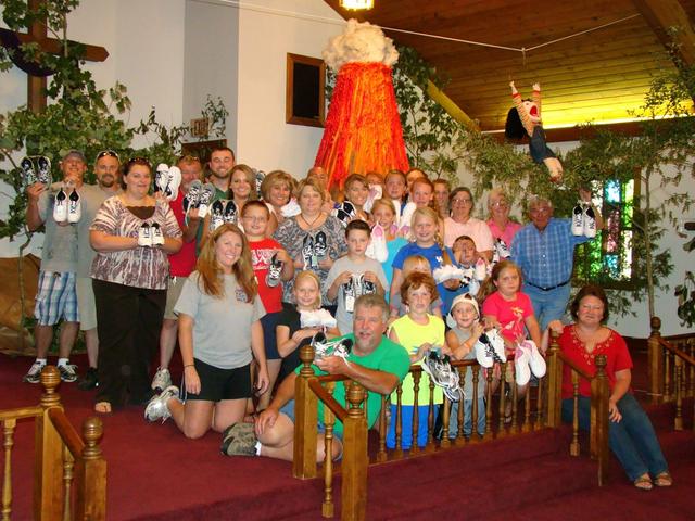 2012-07-30 - 3047 Portland Road, Columbia, Kentucky - Photo by Sandi Smith. A very small portion of the Pickett's Chapel VBS attendees with some of the 39 pairs of shoes that were purchased for the "Kicks for Kids" mission.Front Row, from left - Junior Brown, Briley Taylor, Kayden Greene, Emma Helm, and Sandy McKinney. Second Row - Nancy Taylor, Dawson Burris, Sophie Kimbler, Derek Burris, Carrie Ann Smith, Kaydence Kimbler (almost hidden), Sydney Kimbler, and Will Shepherd, Third Row -Kelli Shepherd, Dariann Smith, Marilyn Brown, Betty Jo Burris, Allison Burris (almost hidden), Ann Smith, Madison Bell, Hailey Taylor, Lelia Smith, Bonnie Janes, and Ollen Janes. Second Row - Billy Shepherd, Jay Kimbler, Barney Taylor, John Updike, Betty Burris (completely hidden but still showing her shoes), Bro. Roger McKinney, Sandy Coffey, Gary Coffey, and Samantha Shepherd. Nancy Taylor