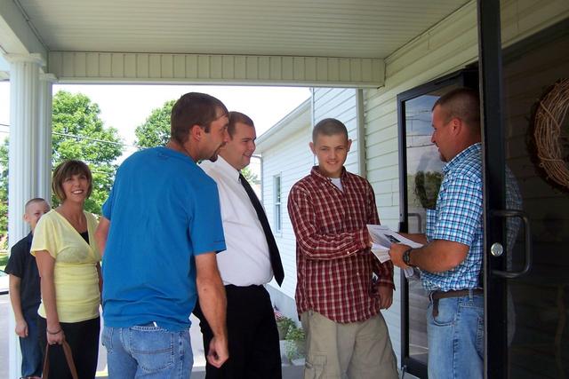 2012-07-30 - 2250 Cane Valley Road, Cane Valley, KY - Photo by Fran Neat. It's a scene repeated hundreds of places with changing casts repeating the similar scenes thousands of times on Sunday mornings in Adair County. This is one vignette at the Cane Valley Christian Church, performed Sunday, July 29, 2012, with, from left, Dustin McGuffin, Julie Breeding, Joe Breeding, Greeter Kyle Cundiff, Terry McGuffin, and Brandon Hitch. from Fran Neat