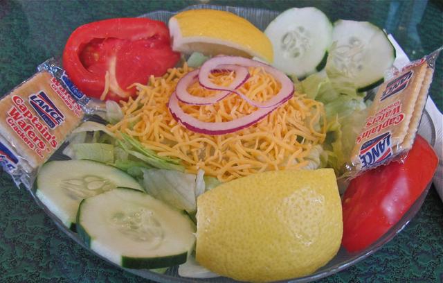 2012-07-27 - 712 Russell Road, Columbia, KY - Photo CR photo. Subject to variations depending on availability of FRESH produce At the Circle R, a fresh cut salad is really fresh, made to order, assembled just before it comes to your table - not shipped in from a factory! This one includes crisp iceberg lettuce, cucumbers, shredded cheese, red ripe tomato slices, and garnished with lemon slices. This customer chose lemon for a dressing, but we have almost every dressing you might choose. The salad is garnished with rings of red onion, to make it as pretty as it tastes. The Circle R Restaurant, 712 Russell Road, Columbia, KY, open Tuesday-Sunday, 6am-10pmCT. Major credit cards accepted.