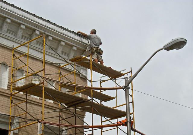 2012-07-27 - 200 Public Square, Columbia, KY - Photo by Ed Waggener. Doyle Burton works high at the top of the Mike Harris/Firestone Building on the corner of Burkesville Street and Public Square repairing metal work at the top of the building. It's part of the renovation of the building, transforming it into the Red Brick Studio, a partnership of Mike Harris and Danny Bailey. Red Nixon is the general contractor for the project.
