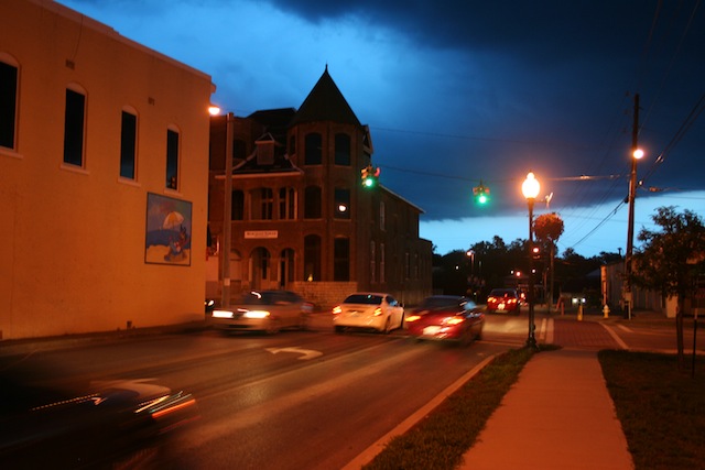 2012-07-26 - Campbellsville, KY - Photo by Larry Smith. Larry Smith, Operations Manager at the Big Dawg, 99.9 FM, Campbellsville, KY, spotted this interesting night sky looking across Main Street in Campbellsville on Monday night, July 23, 2012. Straight ahead in the photo is S. Columbia Avenue, once the main road from Downtown to Columbia, KY. On the left is the Lake Shores Communications/Big Dawg Studio Buiding, and ahead, the tower tops the grand old Merchants Hotel Building, now being renovated. The cross road is Campbellsville's revived Main Street, where Larry's studio is located.