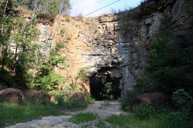 2012-07-26 - Near Confluence, Russell Creek, Green River, W. of Greensburg, KY - Photo by Larry Smith, The Big Dawg, Campbellsville, KY. This rock cliff sits along Russell Creek in Green County on hwy 68 Edmonton road. It' s about 200 feet from where the Russell empties into the Green River, right at the Russell Creek Bridge, at the southwest corner of the span. It's no longer accessible to the public, however. The Green River is on the other side of the tunnel. - Larry Smith, Operations Manager, The Big Dawg FM 99.9, Campbellsville, KY.