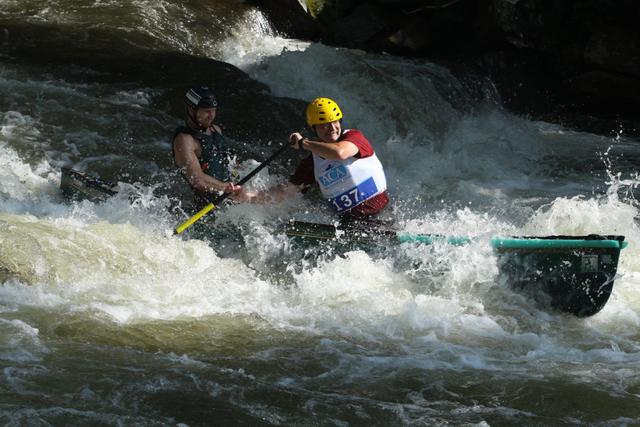 2012-07-22 - Nantahala River, NC - Photo by Duane Bonifer. LWC. White Water Open Downriver Nationals - Lindsey Wilson College Associate Professor of Mathematics Scott Dillery, right, and teammate Zaak Havens head into the stretch of the men's 18-39 OC-2 F16 class of the 2012 White Water Open Canoe Downriver Nationals, held in June on the Nantahala River in near Wesser, NC.