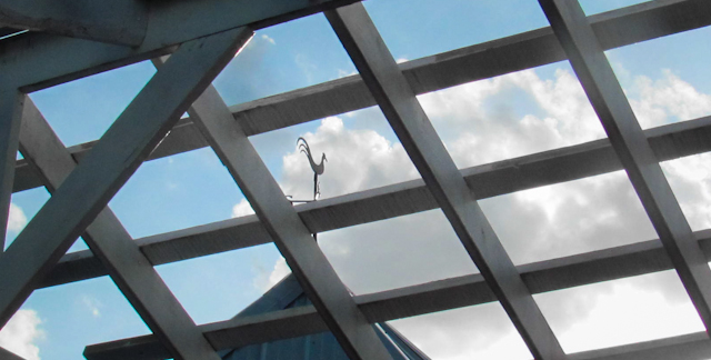 2012-07-23 - 712 Russell Road, Columbia, KY - Photo by Ed Waggener. Once as ubiquitous as house stars are today, only a few structures today are crowned with a Weathervane (Wikipedia) as this one at the Columbia's famed Circle R Restaurant is, seen here from the al fresco dining area in the front of the building. Unlike so many Adair County places of interests, the rooster weathervane at the Circle R may only be no more than 2nd Most Famous in Kentucky. The Dundee Goat in Ohio County may be conceded first place in this category of superlatives, but 2nd Place is pretty good.