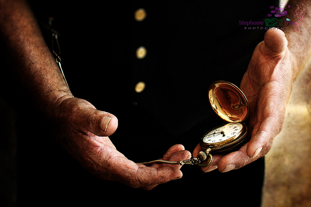 2012-07-22 - Photo by Stephanie Frey. Stephanie writes, "Train conductor from 1920s-1930s looking at his pocket watch. We took our family to ride the trains in Versailles and the conductor was just wonderful. Very good with the kids too." Seen in the ColumbiaMagazine group on Flickr.
