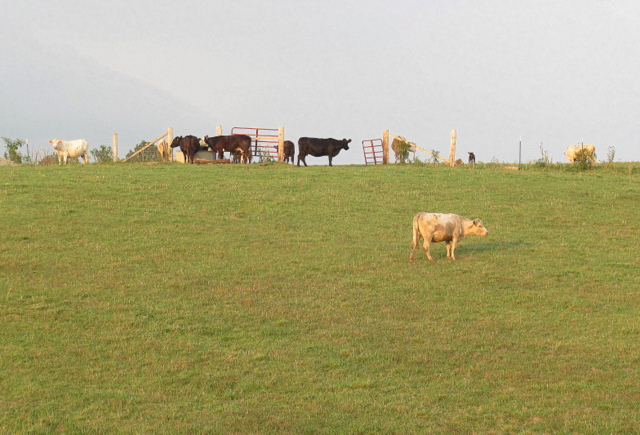2012-07-22 - East of where Jumping Off Place Used to Be - Photo by Ed Waggener. Cows of many colors and sizes graze peacefully along the Columbia-Flatwoods-Chattanooga Highway, oblivious to any danger from Woody's Styrofoam Bear, a scant one half mile down the road and creek bed, which is apparently stalled out half way up a dead tree.