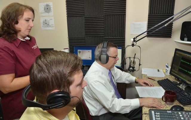 John Chowning's "Dialogue on Public Issues" TV show will be on WLCU-FM 88.7 radio with a call-in interview with U.S. Sen. Rand Paul (R-KY) Wednesday, July 25 and Friday, July 27, 2012 at 6pmET/5pmCT nightly. Chowning, right, interviewed Paul from Washington, D.C. in the Campbellsville University studios at the Office of Broadcast Services. Jeannie Clark, broadcast/digital media producer, left, and Matt Payton, graduate assistant who serves as student radio station manager, helped with the production. Chowning, vice president for church and external relations and executive assistant to the president at CU, talked with Paul about the state of the nation. (Campbellsville University Photo by Joan C. McKinney)