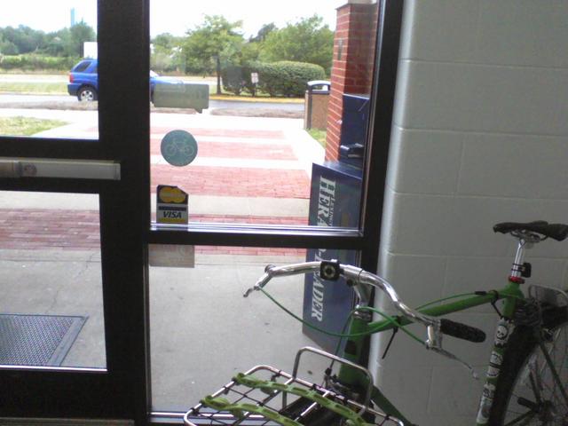 2012-07-18 - Lexington, KY YMCA - Photo from James Brown. LWC graduate James Brown who now lives in Lexington, KY. He was riding his bicycle to work across town when a thunderstorm rolled up on him. He spotted this Bicycle Friendly sticker on the door of the YMCA and sought shelter till it passed. He snapped this photo as he waited out the lightning. A perfect example of the little idea, born from kindness in Columbia, Kentucky in action. - DAVE GRIGSBY