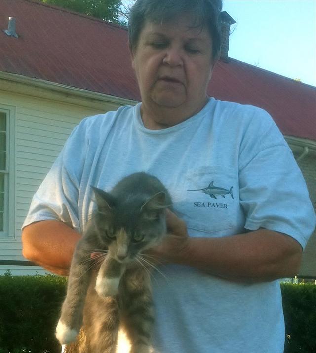2012-07-17 - 201 Jamestown Street, Columbia, KY - Photo by Barbara Armitage. The Adair County Garden Club's newest volunteer helps out at the Trabue House Rose Garden. Oh yea, Maury Lewis was there too. At first I thought that I'd found melewi's lost daughter - they both have that beautiful silver grey hair. This beautiful little kitty has taken up residence at the Trabue House. She's very friendly and a hard worker - she followed me all around the garden this morning while we pruned the roses. She misses her family. If she belongs to you please call Barbara at Tucker's Station 270-250-2979. - Barbara Armitage