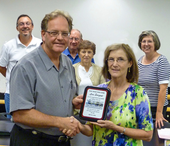 2012-07-17 - Holloway Library, 235 Holloway Drive, Columbia, KY - Photo by George Kolbenschlag. Lindsey Wilson Associate Dean of Academics Lori Sargent who is retiring from the college and the Homeplace on Green River Board is presented an appreciation plaque by Board Treasurer Dr. Max Downey for her contribution to the historic farm. Sargent has been instrumental in the active involvement of a number of students and faculty from Lindsey Wilson at Homeplace. She has also acquired several grants in support of that work. Homeplace Board President Ken Forman characterized her contribution at "extraordinary," and praised her for her contributions in "almost all of the activities at Homeplace and as the designer of the posters, stationery and brochures in support of Homeplace." He told Sargent, "You will be sorely missed." Also in the photo in the background, from left, are Board Vice President Billy Joe Fudge, President Forman, Board Secretary Pat Forman, and Becky Nash ex-officio board member representing the Taylor County Extension Service. Mary Knight, Adair County representative to the board was also at the meeting but is not included in the photo. - George Kolbenschlag