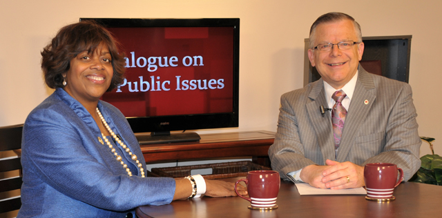 Campbellsville University's John Chowning, vice president for church and external relations and executive assistant to the president of CU, right, interviews Dr. Suzan Johnson Cook, United States ambassador at large for international religious freedom, on his "Dialogue on Public Issues" show on Campbellsville University's WLCU-TV. Johnson Cook was the undergraduate commencement speaker in May at CU. The show will air Sunday, July 22, 2012, at 8amET; Monday, July 23 at 1:30pmET and 6:30pmET; Tuesday, July 24 at 1:30pmET and 6:30pmET; Wednesday, July 25 at 1:30pmET and 6:30pmET; Thursday, July 26 at8pmET and Friday, July 27 at 8pmET. The show is aired on Campbellsville's cable channel 10 and WLCU FM 88.7 at 8amET Sunday, July 22. Joan C. McKinney, Campbellsville University