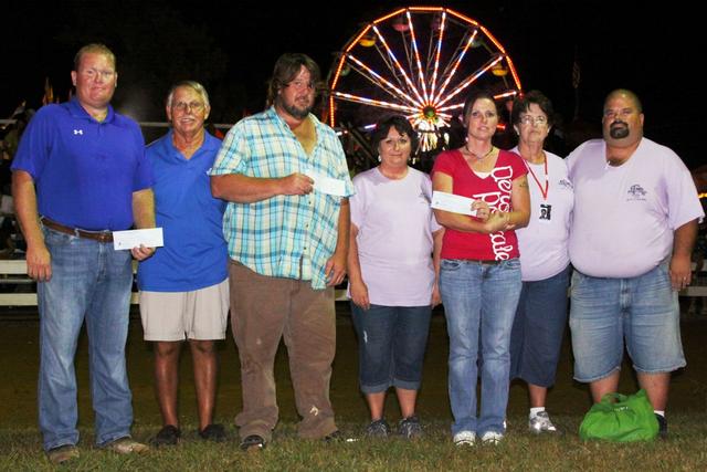 2012-07-16 - 413 Fairground Street, Columbia, KY - Photo by Greg Thomas, Greg Thomas Photography. In following with tradition, on the last night of the Adair County Fair & Horse Show, the fair gave away their grand prize. Prizes have ranged from cars, trucks, motorcycles, and cash. This year it was a total of $10,000.00. In the picture, from left is Brian Robertson, from Columbia, who had the first ticket drawn out and won $5,000.00, Billy Rowe sold him the winning ticket; next is John Gosser, from Russell Springs, KY, who had the second ticket drawn out for a prize of $3,000.00, Jennifer Carter who sold him the ticket; next is Denise Riddle, from Columbia, who had the third ticket drawn out for a prize of $2,000.00, Betty Smith sold her the ticket; and Marc Evan who was the Chairman of the $10,000.00 Give-A-Way. - Greg Thomas