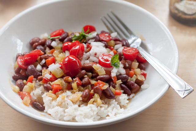 2012-07-16 - An EK kitchen - Photo by Pen. Red beans and rice. A simple, fast one-dish meal starts with a bed of medium grain white rice and a sparing measure of red beans , joined with sauteed diced and raw diced Vidalia onion, halved cherry tomatoes, with a tiny bit of cilantro; it's delicated seasoned to taste. A dedicated rice cooker comes in handy for this dish; red beans from a can save time and summer time energy costs. Best of all - it's a peasant dish fit for a Vanderbilt.