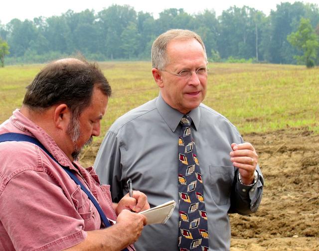 2012-07-10 - Adair County School District Campus, Columbia, KY - Photo by Ed Waggener. Superintendent Alan W. Reed right, carefully framed the answer to a question during a post-groundbreaking interview with Paul B. Hayes, editor of the Adair Progress weekly paper, and the dean of the Adair County news corps. In the background, site preparation was in progress as the ceremony crowd was breaking up. The groundbreaking was held at 11:30amCT, this morning, Tuesday, July 10, 2012.