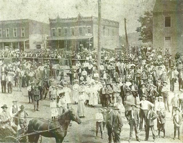 2012-07-10 - Greensburg, Green Co., KY - Photo from the Lanny Tucker collection. The Greensburg Square, thought to be approximately 1900. The view is looking east. The Old Courthouse is on the right, and what is now the Forcht Bank is in the rear center. The event is unknown. Note the telegraph poles, and on the left men are lined at what appears to be a long plank table, or bar. Lanny Tucker, submitted by his sister, Jelaine Harlow
