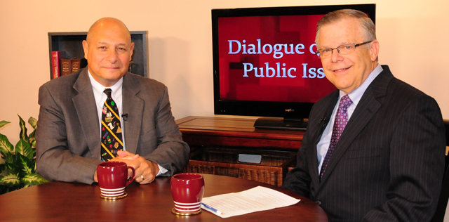 2012-07-10 - WLCU Broadcast Studios, 203 West Broadway, Campbellsville, KY - Photo by Emily Campbell, CU. Campbellsville University's John Chowning, vice president for church and external relations and executive assistant to the president of CU, right, interviews Stu Silberman, who will lead the non-profit education advocacy group, the Prichard Committee for Academic Excellence, effective September 1, on his "Dialogue on Public Issues" show on Campbellsville University's WLCU-TV. Silberman retired as superintendent of the Fayette County School System July 1, 2012. The show will air Sunday, July 15 at 8amET; Monday, July 16 at 1:30pmET and 6:30pmET; Tuesday, July 17 at 1:30pmET and 6:30pmET; Wednesday, July 18 at 1:30pmET and 6:30pmET; Thursday, July 19 at 8pmET and Friday, July 20 at 8pmET. The show is aired on Campbellsville's cable channel 10 and WLCU FM 88.7 at 8amET Sunday, July 15.
