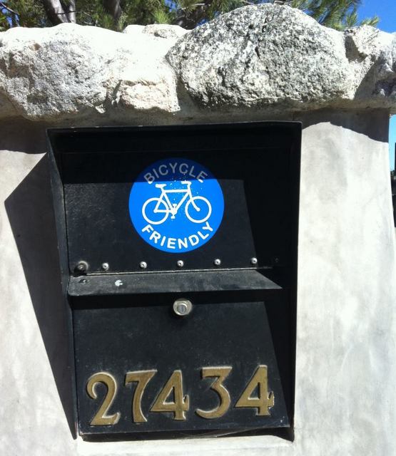 2012-07-10 - Malibu, California - Photo from David Grigsby. David Grigsby, Cycling Coach at Lindsey Wilson College, writes: "Spotted in Malibu, CA at Escondido Canyon and Falls. Sent to me by a friend." For more on obtaining a Bicycle Friendly sticker, see BICYCLES in CM Classifieds.