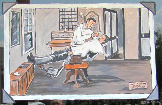 2012-07-09 - Public Square, Burkesville, KY - Photo by Ed Waggener. Fabulous street art abounds in Burkesville, KY. This painting in the window of Keith's Barber Shop depicts a scene from yesterday captioned, "Abner Cary shaving Mr. Coleman in the Parkway Building." It is signed "C. Cash-P. Ritter," for the artist due - Charlotte Cash and Patricia Ritter - responsible for so much of the art which distingushes the Cumberland County county seat as a visual arts destination city.