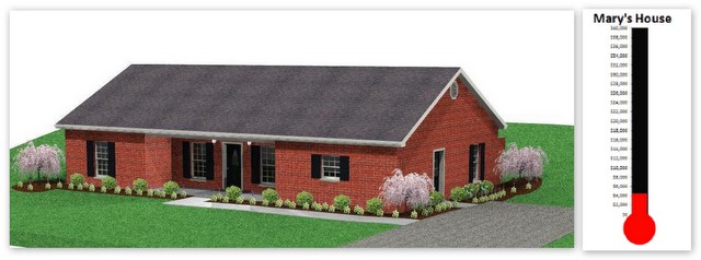 2012-07-05 - Cane Valley, Adair Co., KY - Photo house by Benton Fudge; thermometer by Fran Neat. Benton Fudge of South Central Designs provided this drawing of Mary's House, which is being built for Mary McGuffin and her seven children who lost their home and most of their possessions in a Keltnertown fire. When the thermometer is full - all red - the goal of $40,000 will have been reached. The target date is by August 1, 2012. That means a little over $1,000, on average, per day, will have to be raised. For information on helping the cause, click ReadMore.