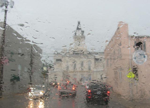 2012-07-05 - 100 Block, Burkesville Street, Columbia, KY - Photo by Ed Waggener. It may not last long enough to count, but it's been welcome. These mercy drops were enough to settle the dust and lower the temperature to below 80 degrees, and were even enough to obscure the time on the clock at Robert's Bank. The picture was taken at about 4:15pmCT, Thursday, July 5, 2012.