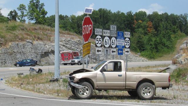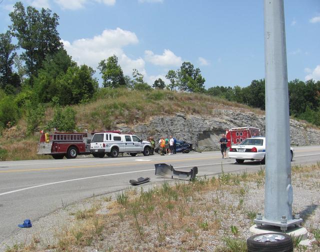 Columbia City Police were the first on the scene following a two vehicle injury collision at the intersection of Greensburg Street and the Adair County Veterans Memorial Bypass, at around 11:45amCT, this morning, July 4, 2012. Two occupants of the small, late model, 4 door Ford in the center of the vehicle were taken from the scene by Adair County EMS. They were identified at the scene only as being from Columbia, KY. The driver of the second vehicle, a tan Toyota Tacoma, whose driver is from Russell County, remained a the scene and appeared to be uninjured. Other emergency responders included the Adair County Fire Department, The Emergency Management Director's Hazmat truck, the Adair Search & Rescue Team, and Adair County Constable Joe Collins. Items from the wreckage are strewn from the light standard to the resting point of the blue Ford vehicle include a wheel and bumper that vehicle, and possibly hat believed to have been worn by the driver of the second vehicle.