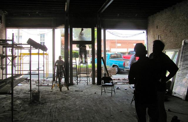 2012-07-03 - 200 Public Square, Columbia, KY - Photo Columbia, KY. Renovation work on the old Firestone Building is progressing at an incredible pace. Side windows are now bricked in, and new windows for the upper floors should go in any time. Today, work taking the "modern" retailing window bays out, in preparation for a flush front, actually with more of a retro look. Standing at left, foreground, is Red Nixon, in charge of the renovation for owner Mike Harris, and Ben Arnold, quite possibly the biggest major investor in Public Square Property in the history of Adair County and the next previous owner of the building. An irony - some two decades ago Mr. Arnold had the same vision for the corner - a recording studio - with the same partner in mind as Mr. Harris is now working with - Danny Bailey. And, possibly more than anyone in Columbia, he's elated that that dream is being carried out, though he's no longer directly involved. While the work on the Red Brick Recording Studio is going well, Mr. Nixon won't yet venture a target date for its completion.
