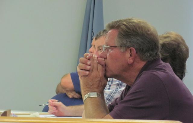 2012-07-04 - City Hall, 116 Campbellsville Street, Columbia, KY - Photo by Ed Waggener. Columbia City Councillor Robert Flowers foreground at Columbia City Council, Monday, July 2, 2012. Flowers made the only modification in a series of four minutes approvals, calling for a note on the July 21, 2012 budget approval meeting to note that the overall city budget imbalance would be a minute fraction of the overall spending measure. He said that he believed over the course of the year modifications to the budget might bring it into a surplus situation. Partially seen, behind him front to back, are Councillors Linda Waggener and Craig Dean, and City Attorney Marshall Loy.