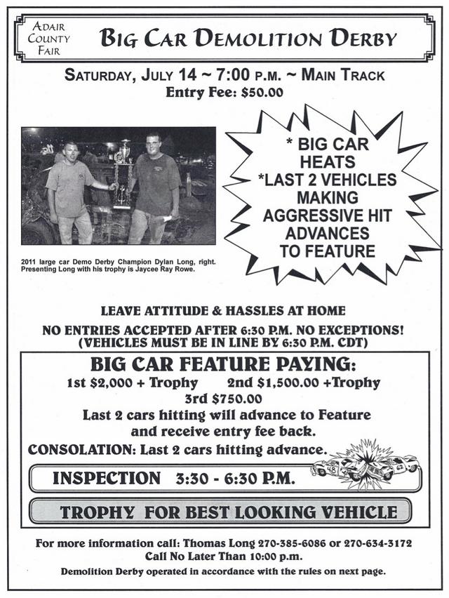 - AdairCountyFair.com/Demolition Derby for lins to Informational PDFs on Big Car Info, Small Car Info, and Rules PDFs on Big Car Rules, Small Car Rules, and Lawn Mower Rules