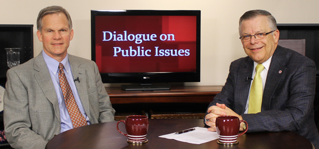 2012-06-27 - WLCU Broadcast Studios, 203 West Broadway, Campbellsville, KY - Photo by Sarah Ames, CU photo. Campbellsville University's John Chowning, vice president for church and external relations and executive assistant to the president of CU, right, interviews Dr. J. Bradley Creed, provost and executive vice president for Samford University in Birmingham, AL, on his "Dialogue on Public Issues" show on WLCU-TV. The show will air Sunday, July 1 at 8amET; Monday, July 2 at 1:30pmET and 6:30pmET; Tuesday, July 3 at 1:30pmET and 6:30pmET; Wednesday, July 4 at 1:30pmET and 6:30pmET; Thursday, July 5 at 8pmET and Friday, July 6 at8pmET. The show is aired on Campbellsville's cable channel 10 and WLCU FM 88.7 at 8amET Sunday, July 1. Joan C. McKinney