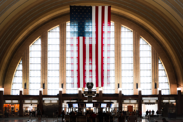 2012-06-27 - Cincinnati, OH - Photo by Pen. An impressive American flag greets visitors to the Cincinnati Museum Center, housed in Union Terminal, an Art Deco treasure just under 4 hours from Columbia. Originally built during the Great Depression to house and organize Cincinnati's rail system, the building has been home to History and Science Museums since 1990. The main lobby is in the second largest free standing half dome in the world, smaller only than the Sydney Opera House.